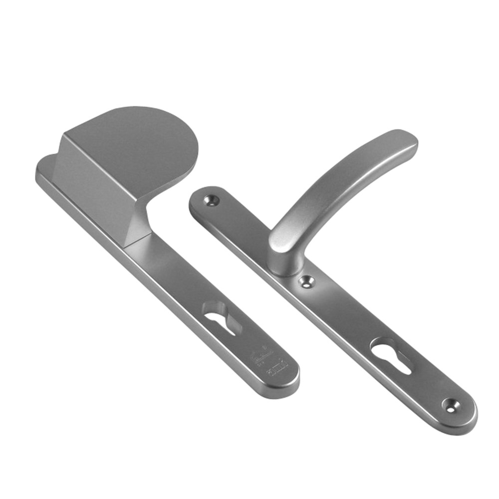Complete set: Buitenschild 12 mm met deurduwer 90/83, binnenschild 8 mm met deurkruk 377 vastdraaibaar, vierkantstift 8 mm en 3 schroeven M6 RVS